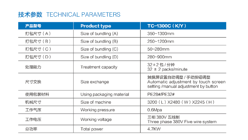 TC-1300C(K/Y)型高速展繩捆綁機送紙結構為下壓搓入與皮帶輸送組合方式,其結構緊湊、結合尾部拍齊裝置,傳送精準高效,運行平;采用plc控制,人機界面調節參數配合雙十字開關微量修整調整,更易于操作,換單快。打包相關動力采用伺服電機驅動、國際知名品牌(FESTO/SMC)氣動元件,動作流暢,性能穩定,節能。